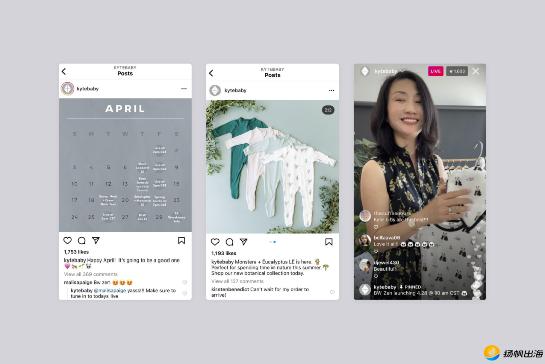 事实上,这一积累来源于其在社媒运营、社群建设上的不断努力。在Instagram上,Kyte Baby积极与用户展开互动,借助信息流推送与快拍功能,让客户了解品牌的最新动态,包括即将推出的新产品、产品细节等,持续发布每个月的活动日历,同时定期进行直播与用户及时交流。