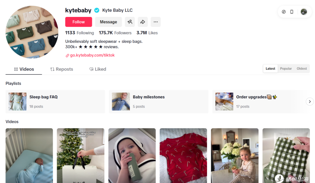 在海外另一社媒TikTok上,Kyte Baby的粉丝数也超过了17万,其账号内容大多为婴儿着装实拍、面料展示、亲子互动等。