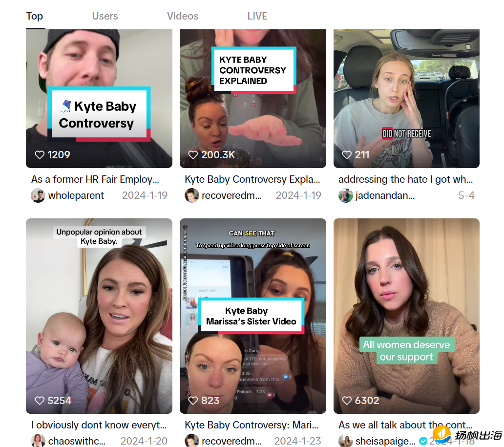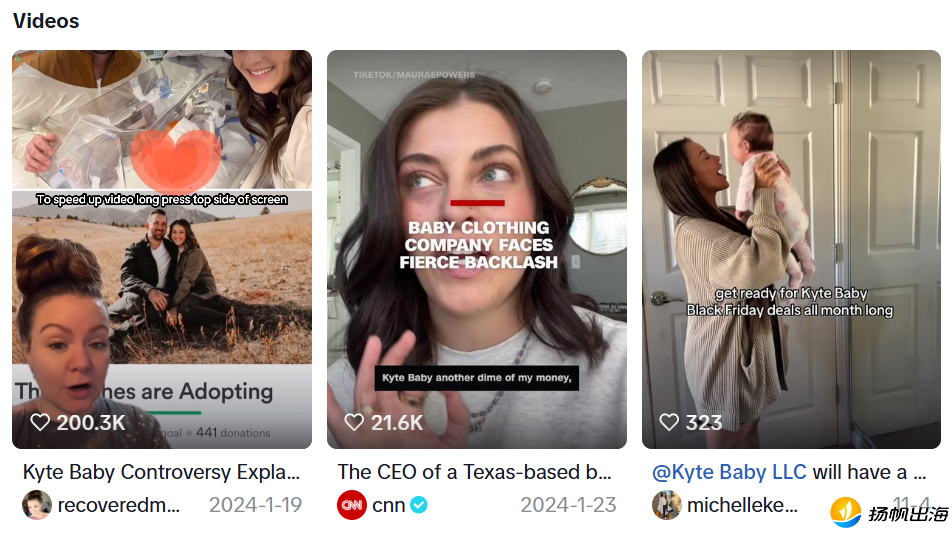 但在流量与营收之外,另一种声音也在互联网存在。在TikTok上,与 “Kyte Baby” 相关的热门内容,不只是育儿分享和穿搭推荐,还有一场曾让品牌陷入舆论漩涡的争议。