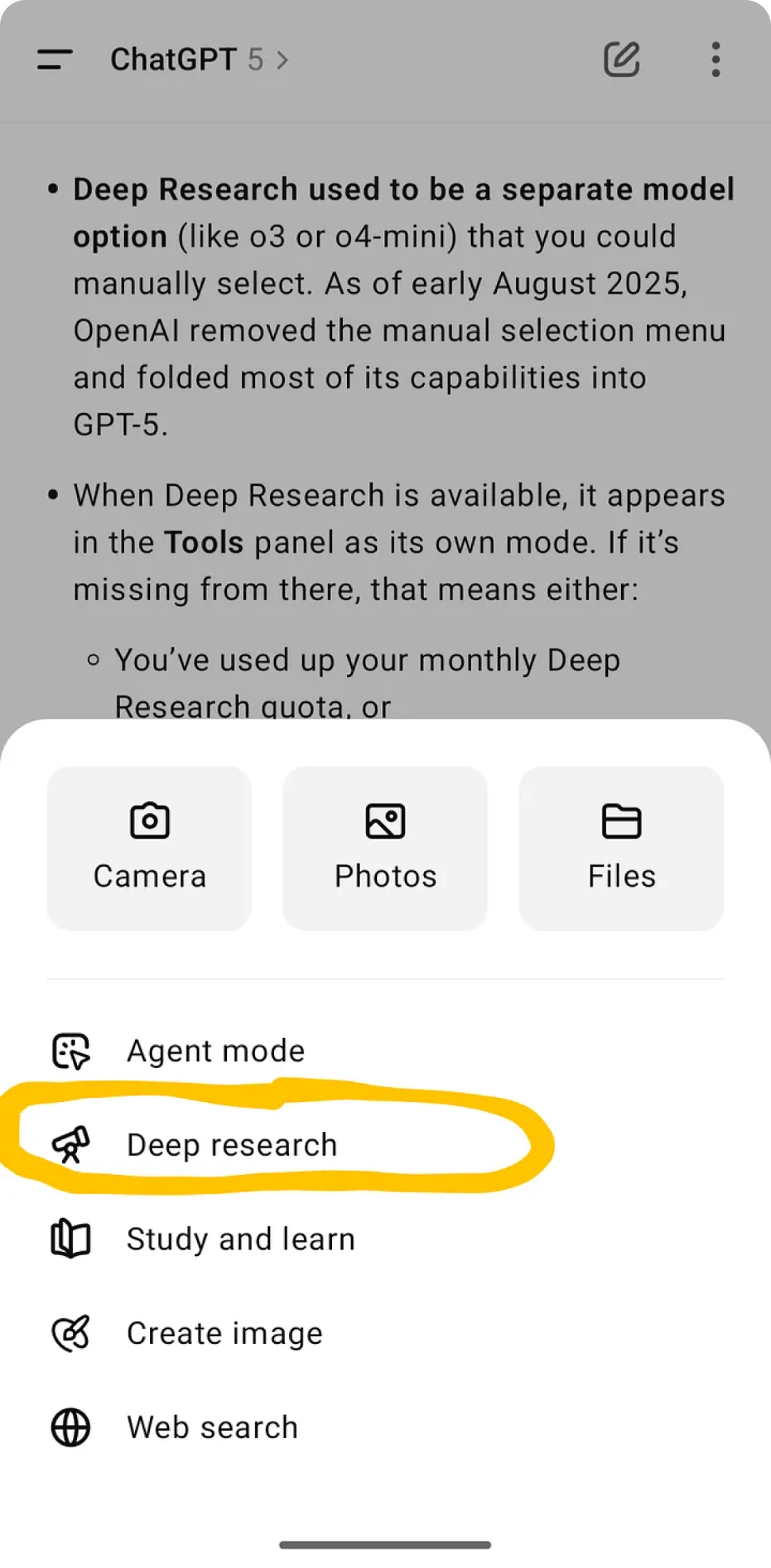 更新 —— 2025 年 8 月 10 日:OpenAI 推出了最新的旗舰模型 ChatGPT 5,并停用了包括 4-o、o3 等在内的多个旧模型。不过,深度研究功能仍可在提示栏左侧的工具列表中找到 —— 点击图片图标可查看完整列表。