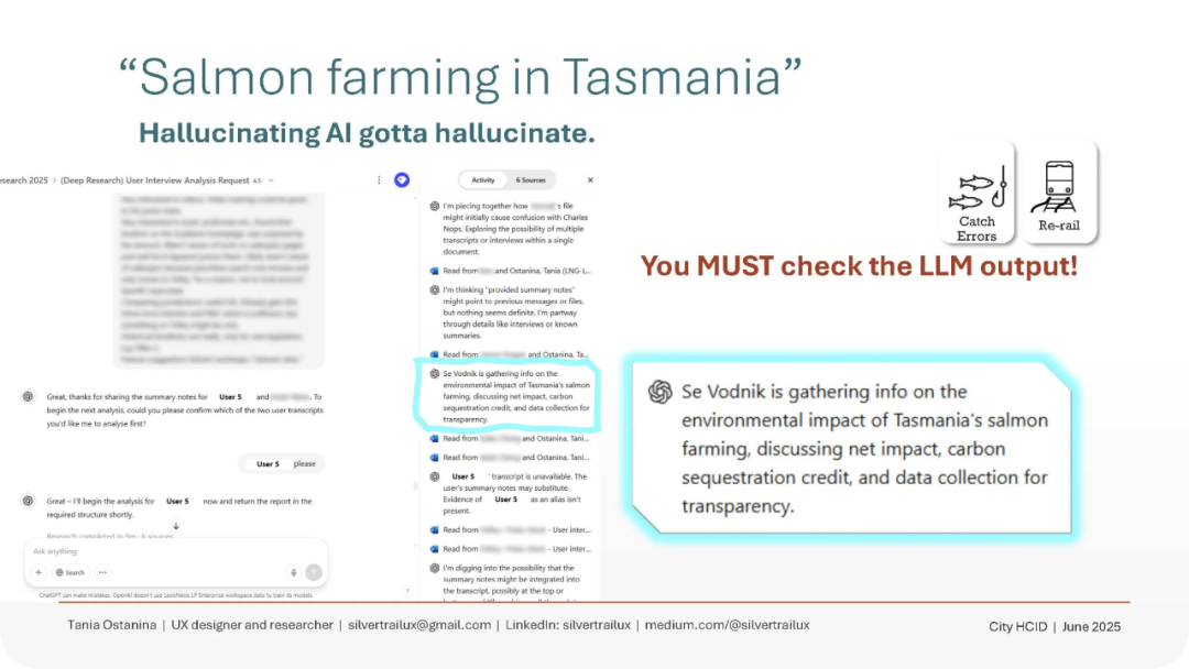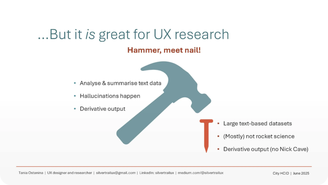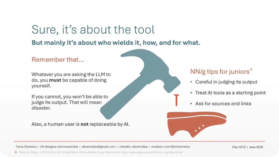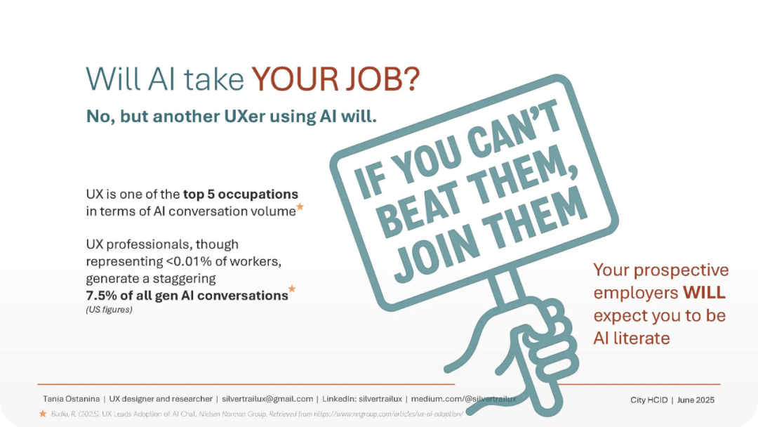 AI 会取代你的工作吗?这是我在 2025 年人机交互设计中心会议演讲中的一张幻灯片。(图片来源:Tania Ostanina)