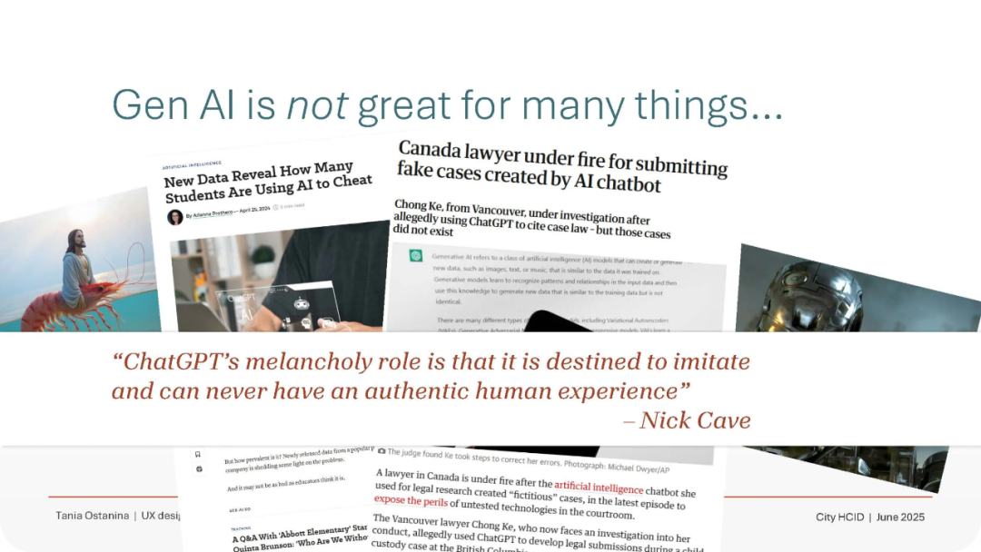 正如尼克・凯夫(Nick Cave)所说,生成式 AI(GenAI)并非在所有方面都出色。这是我在 2025 年人机交互设计中心会议演讲中的一张幻灯片。(图片来源:Tania Ostanina)