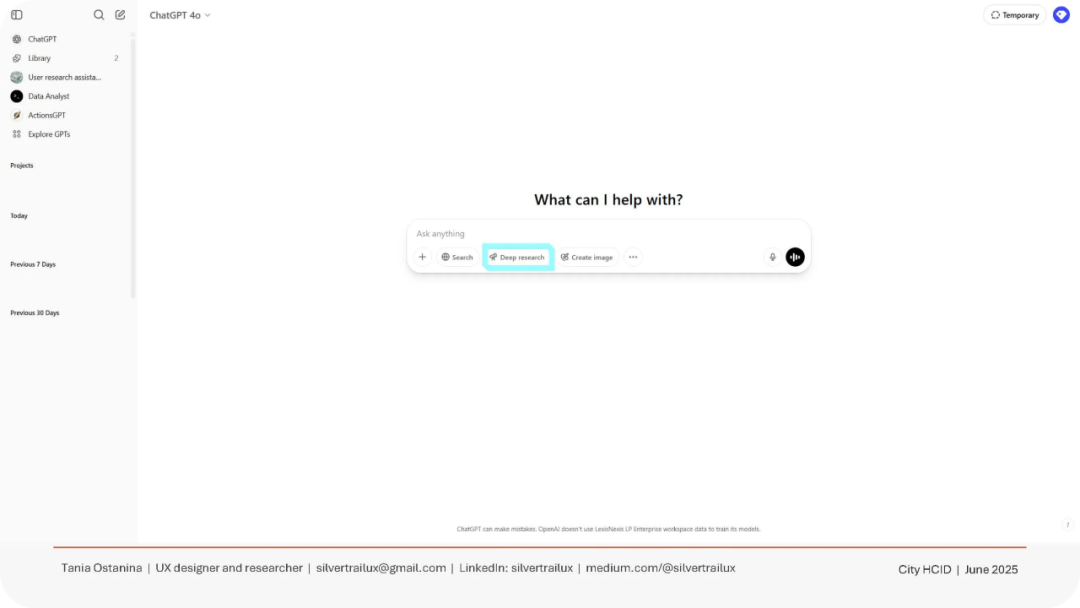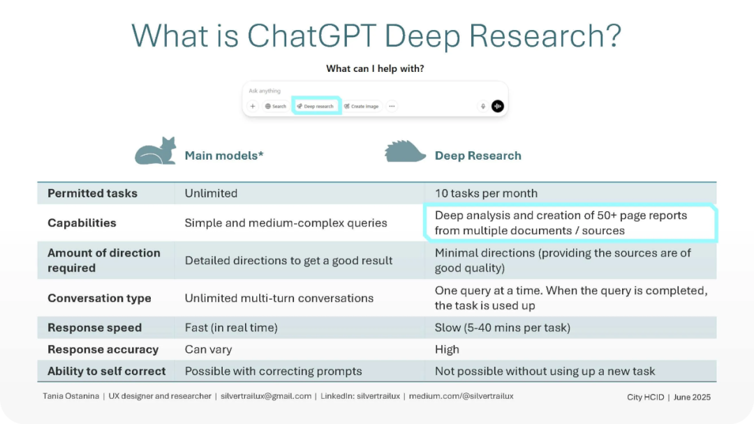 深度研究功能与传统模型的对比。这是我在 2025 年人机交互设计中心会议演讲中的一张幻灯片。(图片来源:Tania Ostanina)