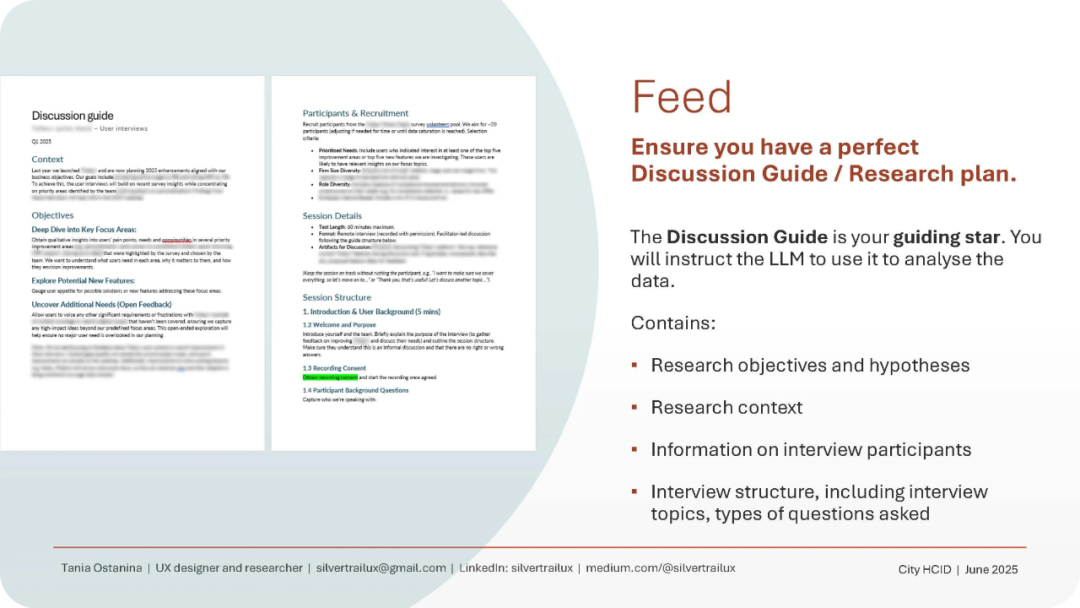 讨论指南 / 研究计划的重要性。这是我在 2025 年人机交互设计中心会议演讲中的一张幻灯片。(图片来源:Tania Ostanina)