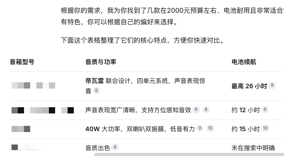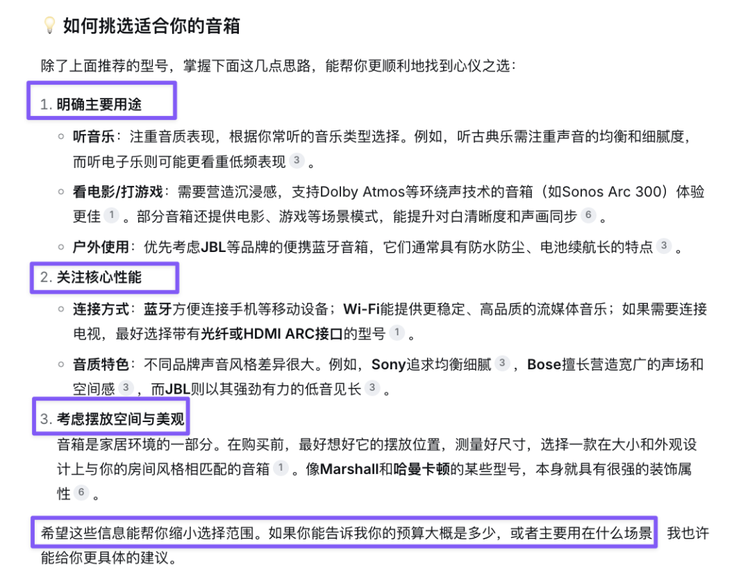 举个例子,当我跟DeepSeek说“我想找最好用的音箱”,很快Ta给我一个表格,还很贴心地提出“从不同的用途、性能、外观甚至预算方面给出更明确的需求,才能给出更具体的建议”。