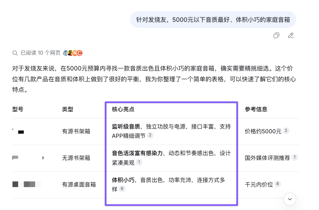 好了,想好产品定位是面向发烧友的高端产品,那么当某用户问起“5000元以下音质最好,体积小巧”时,我们的产品就有可能被推荐(当然内容也要在各个媒体上能被AI看见)。