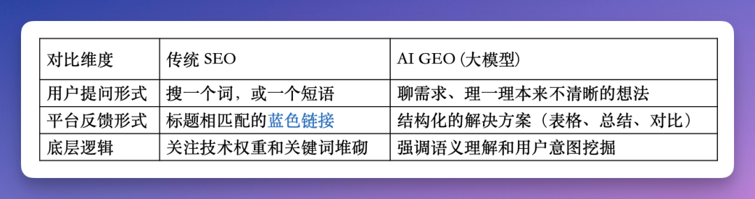 传统 SEO 关注技术权重和关键词堆砌,而 AI 大模型强调语义理解和用户意图挖掘。