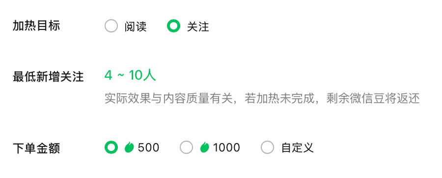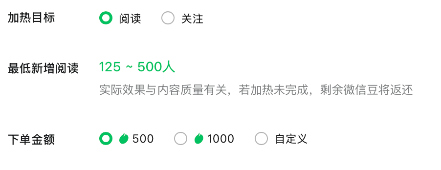 在加热页面,微信官方相应标注了“实际效果与内容质量相关”的说明,可见500微信豆换来的最低新增阅读125-500人,具有一定的浮动性。