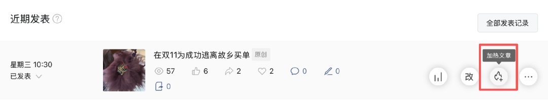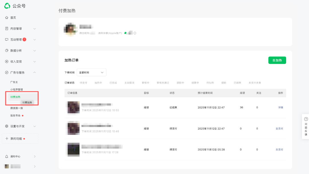 细化到实操层面,用户可在已发布文章的记录中,选择“加热文章”,或者在“广告与服务”菜单栏下,选择“付费加热”。