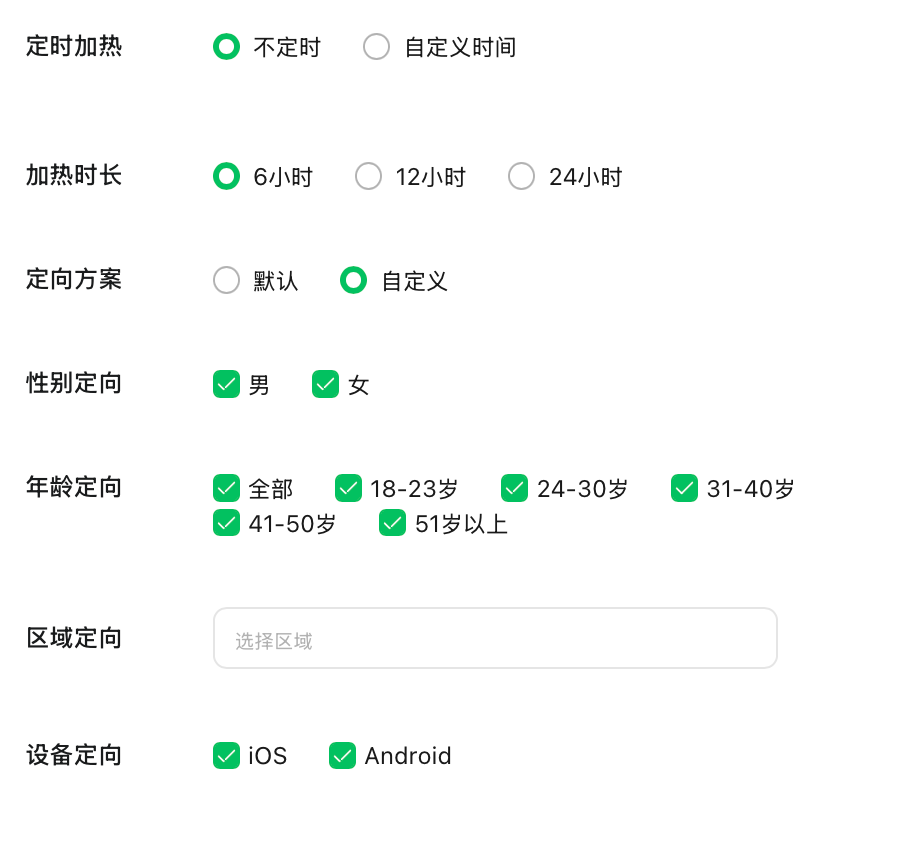 付费加热方案支持自定义化,可选择时长、性别、年龄、区域、设备等定向维度。如选默认,即上述条件均勾选。