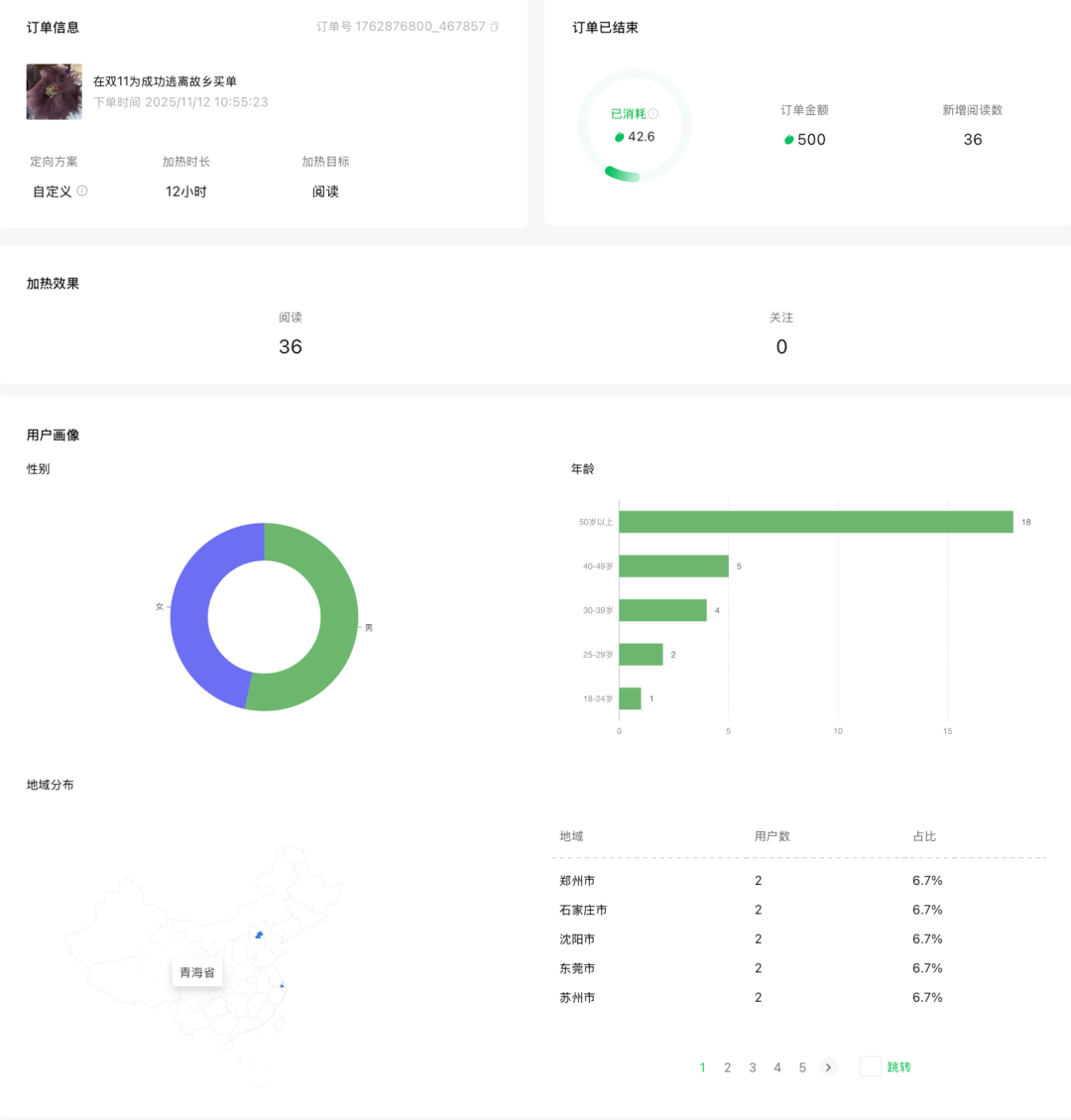 11月12日上午,我们对该公众号近期发布的一篇情感类原创内容进行付费加热。数据显示,加热12个小时后,该文章新增36个阅读,消耗42.6微信豆。