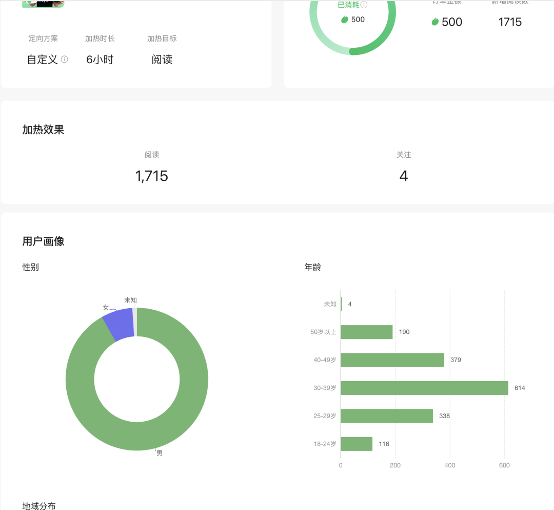 对于新增的阅读数,也有相应的用户画像,包含性别、年龄、地域分布。
