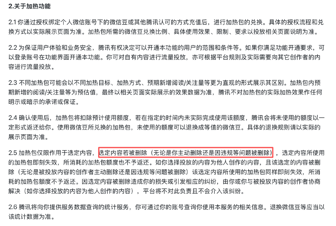 微信官方说明中还提到,公众号加热包仅限作用于选定内容,若内容被删除,无论是主动删除还是因违规等问题被删除,所消耗的加热包不予以返还。