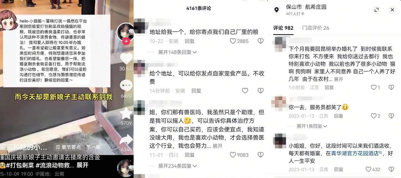 昆明本地的几家酒店主动联系她,表示愿意定期提供安全的剩余食材。一些参加婚宴的宾客看到她的视频后,也开始在自家聚会后打包食物投喂附近的流浪动物。