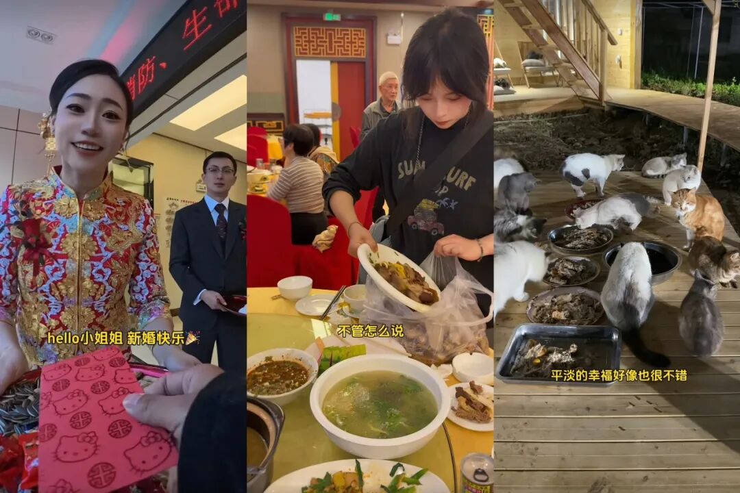 直到视频最后,画面一闪而过几只扒着食盆的小猫,大家才猛然惊醒,原来这姑娘勇闯婚宴的背后,藏着一场给“毛孩子”的温柔奔赴。