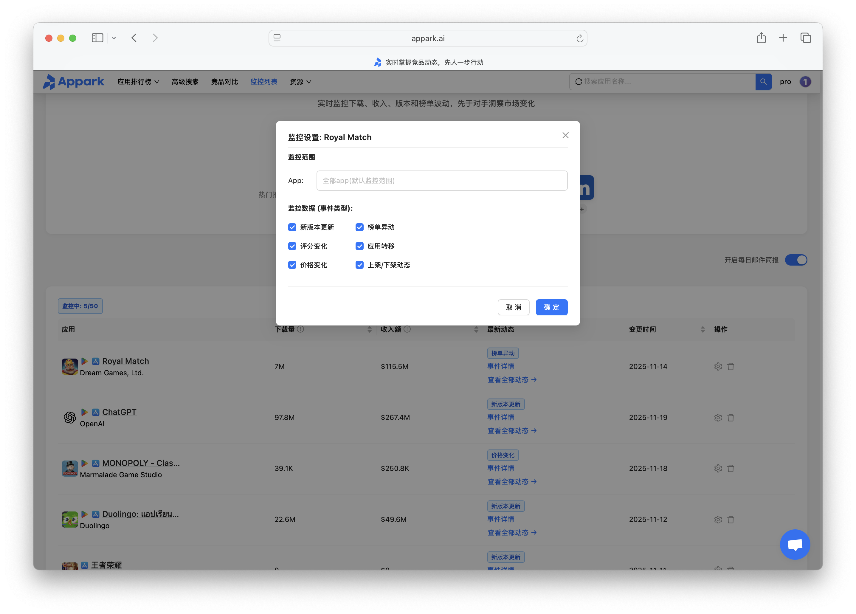 - 使用轻量的数据监控工具 (这里我推荐类似 Appark 类型或其他多维度分析工具):监控竞品下载量、收入趋势、版本更新时间、榜单波动。