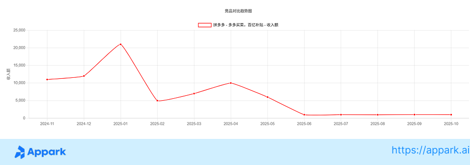 最近,我在Appark关注到了拼多多iOS端近一年(2024.11-2025.10)的三组有趣数据:下载量的脉冲、预估收入的“归零”以及榜单的突然震荡。