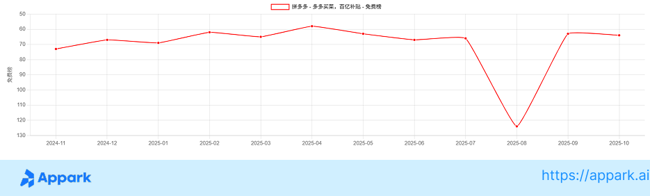 【数据现象】 2025年8月,长期稳定在60-70名的拼多多,突然跌出100名开外,随后迅速拉回。