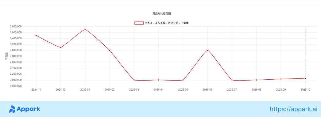 【数据现象】观察拼多多的下载量曲线,最显著的特征是:常态流量在2025年2月后下一个台阶,但6月(618大促期间)出现了一个孤立的波峰。