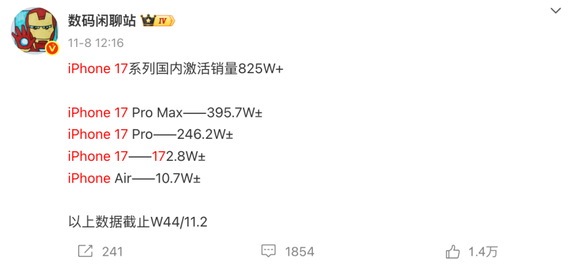 不过,整体来看,苹果抖音官旗的销量并不算多,据数码博主“数码闲聊站”透露,截至11月2日,iPhone 17系列在中国累计激活销量已超过825万台。
