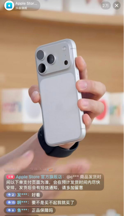 苹果官旗入驻抖音以来,不少人冲着正品和售后保障而来。第三方平台数据显示,自8月29日入驻以来,苹果官旗直播间已经吸引了约4000万人涌入。