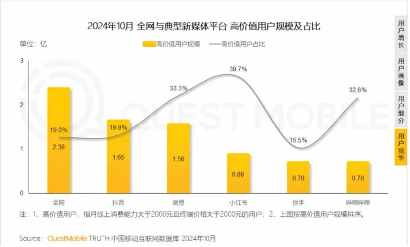 尽管抖音月活超10亿,但是却困囿于高价值用户(即月线上消费能力及终端价格均大于2000元)。QuestMobile数据显示,截至2024年10月,抖音的高价值用户比为19.9%,略高于全网19%的占比,但是低于小红书、B站、微博的40%、33%、33.3%。