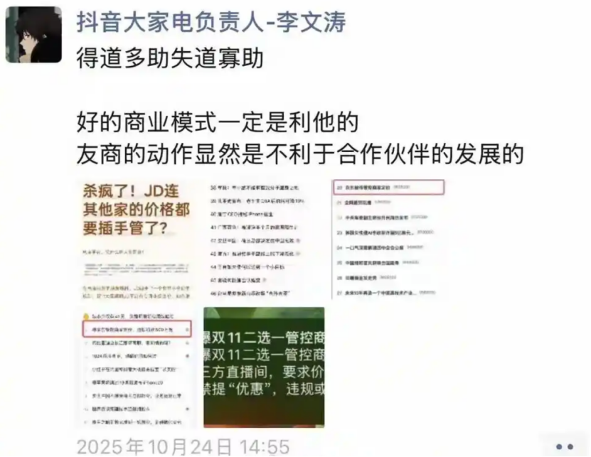 双十一期间,因为一张美的集团因价格问题遭京东罚款500万元的截图,京东被指责“二选一”。抖音大家电负责人李文涛就在朋友圈喊话,指责京东“得道多助失道寡助”,并称“友商”(京东)动作不利于合作伙伴的发展。