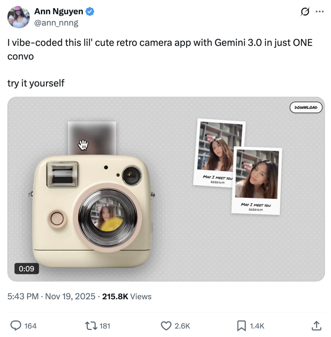 才刚发布一天,Gemini 3 Pro 就被网友玩出花:从数字拍立得到 3D 小游戏,从一张图秒变应用到自动生成工具,AI 创造的门槛似乎真的降到了零。
