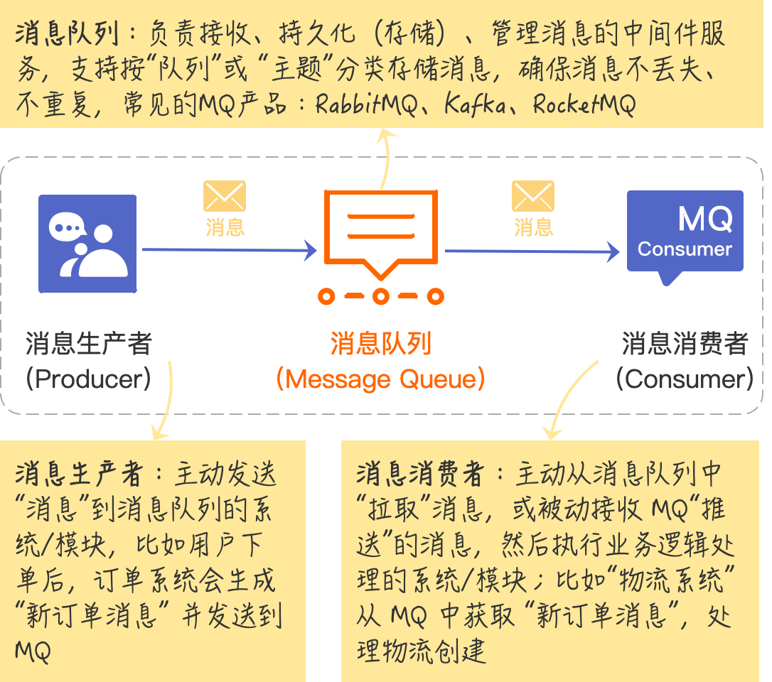 这个故事你一定熟悉:你熬夜血拼的宝贝到达网点后,快递员(生产者)拿到你的包裹(消息),根据你的地址找到附近的蜂巢柜(MQ),将快递放进去(发送消息到 MQ),蜂巢柜(MQ)确认快递放入后自动锁柜,并生成一条取件码发送到你的手机(MQ向生产者确认 “消息已接收”),你下班后看到取件码(消费者感知到消息),到蜂巢柜输入取件码(消费者读取消息)打开柜门取走快递(处理消息),并随手关上柜门(向 MQ 发送 “确认已接收”),柜子标记该格位 “空闲”(MQ删除已消费的消息)