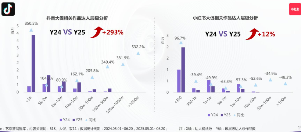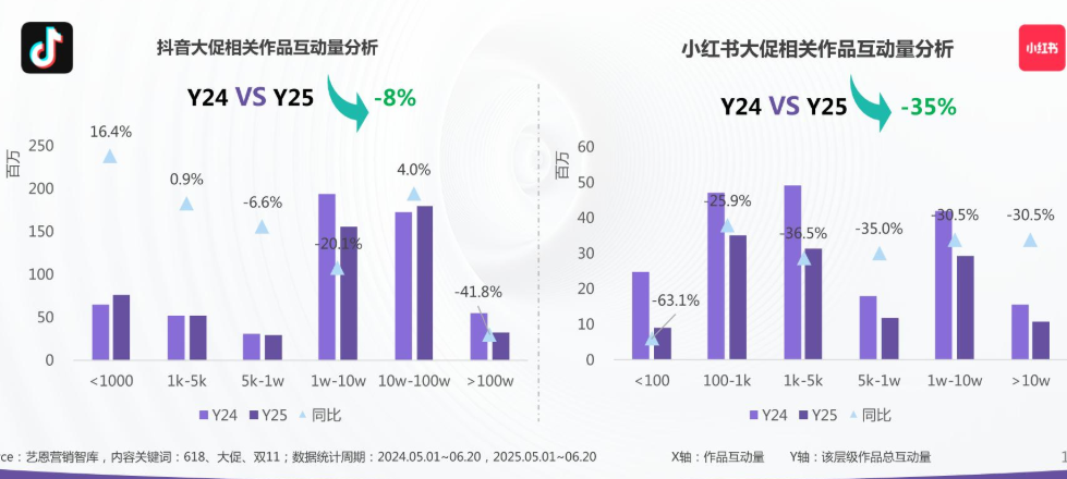 商家们正在陷入 “投入越多,效果越差” 的怪圈。2025 年大促相关作品数量暴增 110%,KOL 数量激增 182%,但用户互动总量却下滑 7%,分享欲更是暴跌 33%。