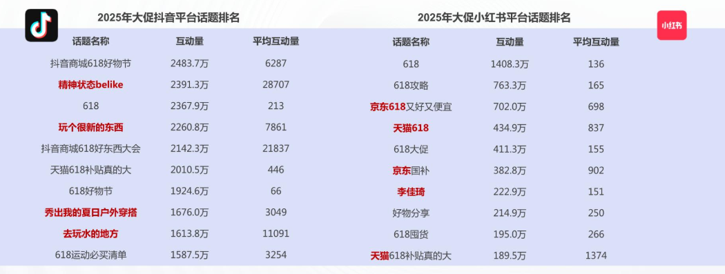 平台偏好分化明显:抖音用户爱刷 “618 运动必买清单” 等内容型话题,小红书用户则更关注 “京东国补”” 天猫补贴 “等引流信息。