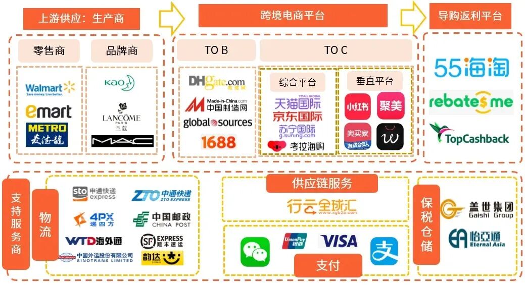 B2C跨境电商: B2C跨境电商是指企业借助电商网站,直接面向全球个人消费者销售产品的跨境电商模式。是目前跨境电商的主流模式,行业份额占比高,渠道众多。