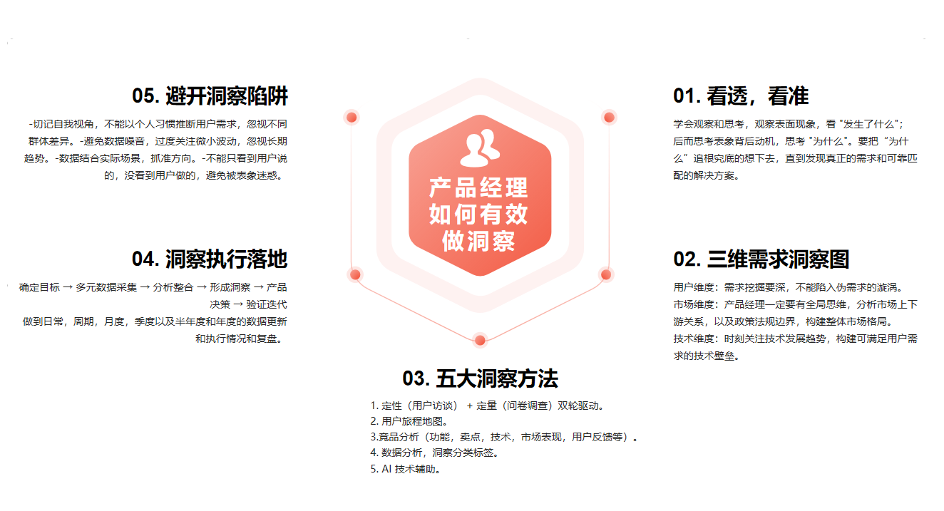 需求洞察是产品开发的起点,产品失败的核心原因,80%是“需求洞察失误”,把表象需求当真实痛点,或把伪需求当刚需。需求洞察的本质是“穿透用户语言,找到行为背后的未被满足的期望”。其核心价值首先可以降低企业风险:避免“自嗨式开发”,识别用户真正想要什么,明确开发方向避免资源和人力上的浪费。其次,需求洞察可以深挖需求打造产品与竞品之间的差异化,找到竞品未覆盖的痛点,发现未被满足或者被忽略的机会点,形成独家优势和商业价值;最后精准的需求洞察可以提升产品复购和增加用户粘性,建立用户口碑,形成从洞察到爆品的闭环,从而形成复购。