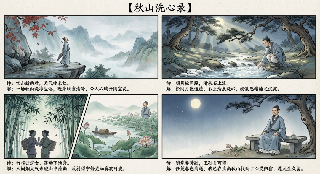 配上古风4格漫画,每一个画面配上诗句和中文解释。4个画面需要统一,包括风格,诗句所在位置,中文解释所在位置。合成一张4格漫画。