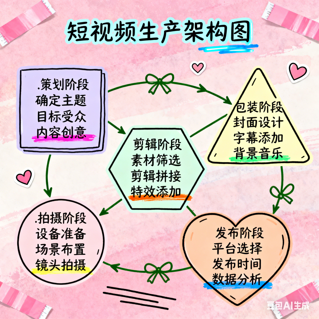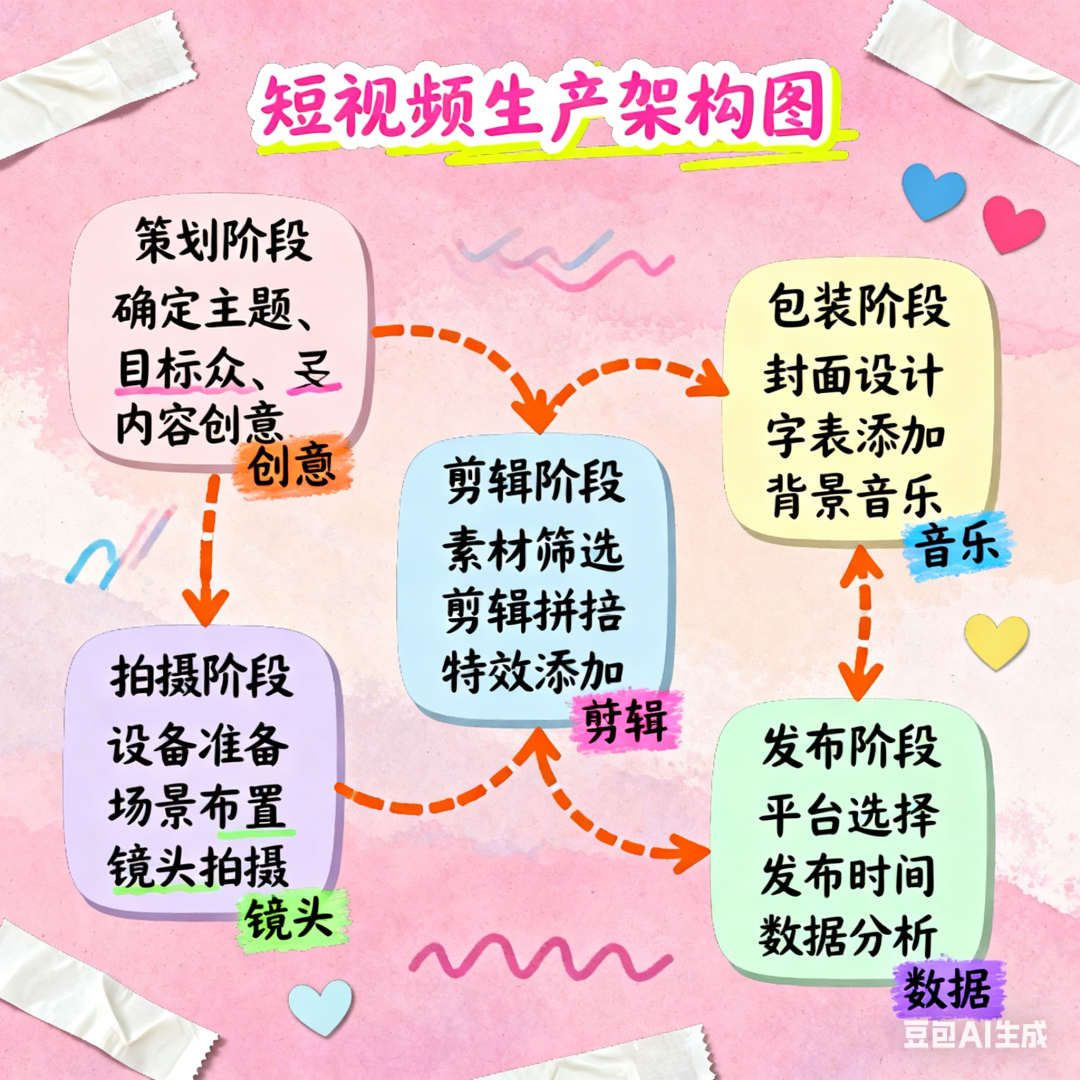 输出一张手账风格的《短视频生产架构图》的插画式信息图,有详细中文文字说明