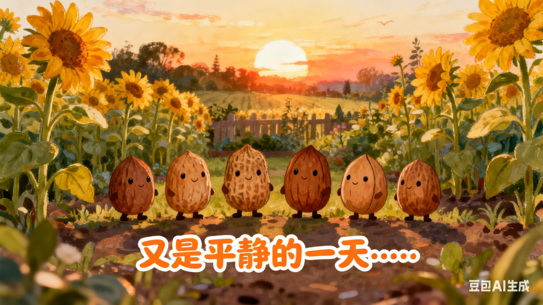 画面:广角镜头,温暖的夕阳下,戴夫的花园一片祥和。向日葵随着微风轻轻摇摆,散发着金色的光芒。一排坚果憨厚地站在前排。