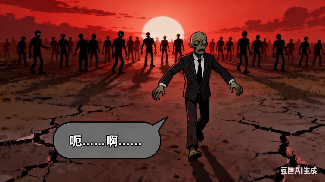 画面:地平线上,僵尸的剪影成群结队地出现,在逆光中显得扭曲而恐怖。领头的普通僵尸伸着双手,步履蹒跚。