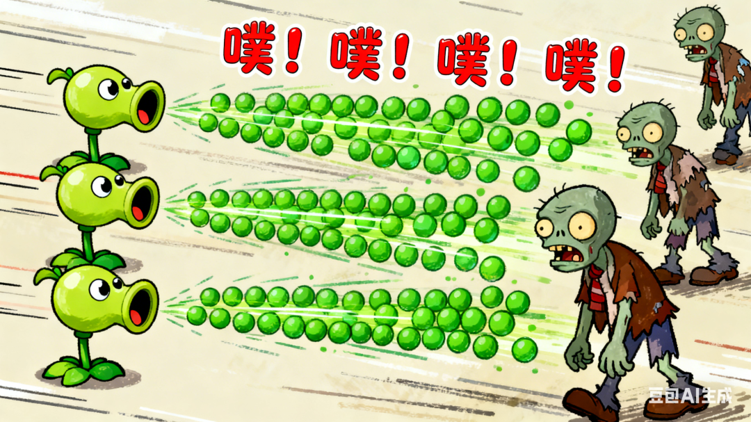 画面:动态斜角镜头。三排豌豆射手同步发射,绿色的豌豆像子弹一样形成弹幕,划过画面,直飞向前排的僵尸。