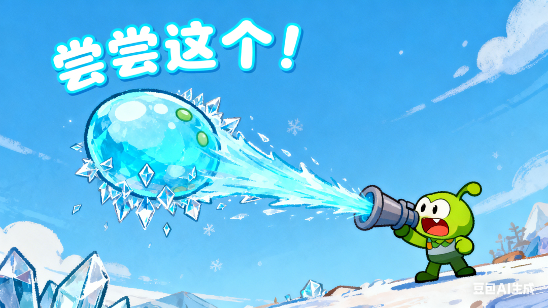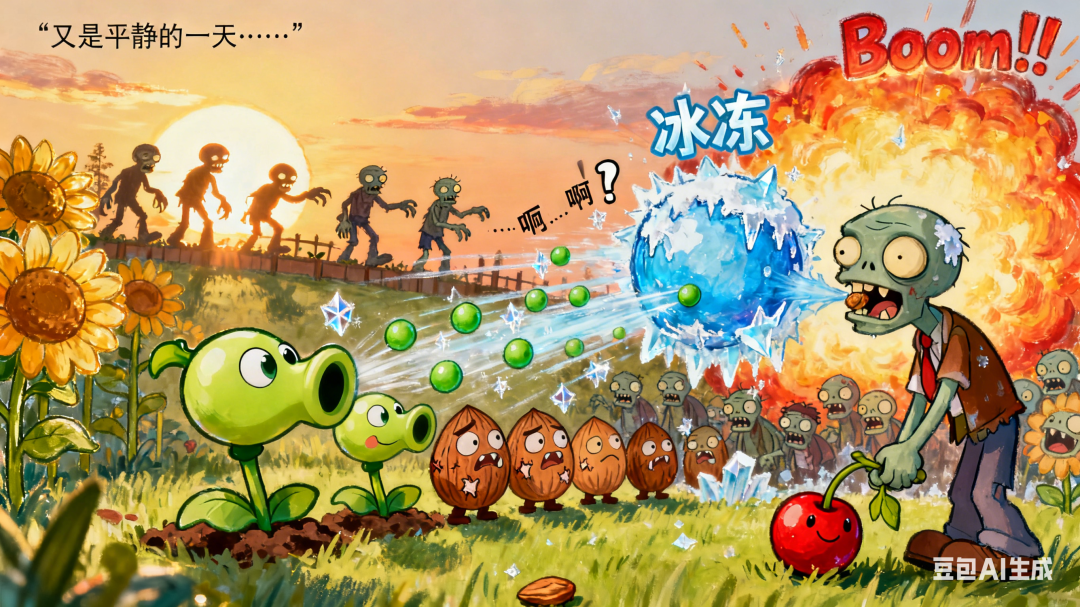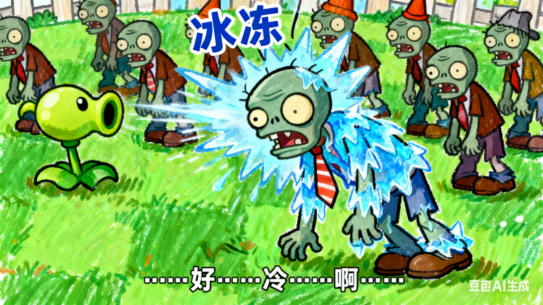 画面:被寒冰豌豆击中的僵尸,全身覆盖蓝色冰霜,动作变得极其缓慢,头上冒出“冰冻”特效字。它身后的僵尸也因此减速,队伍陷入混乱。