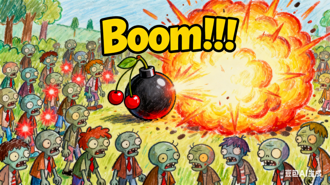 画面:樱桃炸弹在僵尸群最密集的地方闪烁着红色的危险光芒,下一个瞬间,它爆炸成一个巨大的火球,吞噬了范围内的所有僵尸。