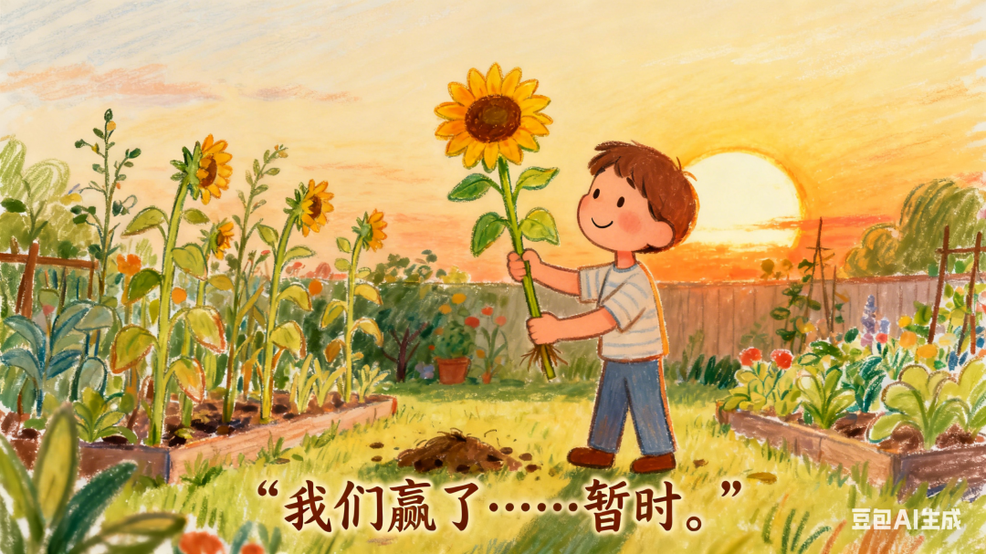 画面:黎明时分,阳光再次洒满花园。植物们虽然略显疲惫,但都欢快地摇曳着。戴夫捡起一株掉落的向日葵,对着初升的太阳露出了微笑。