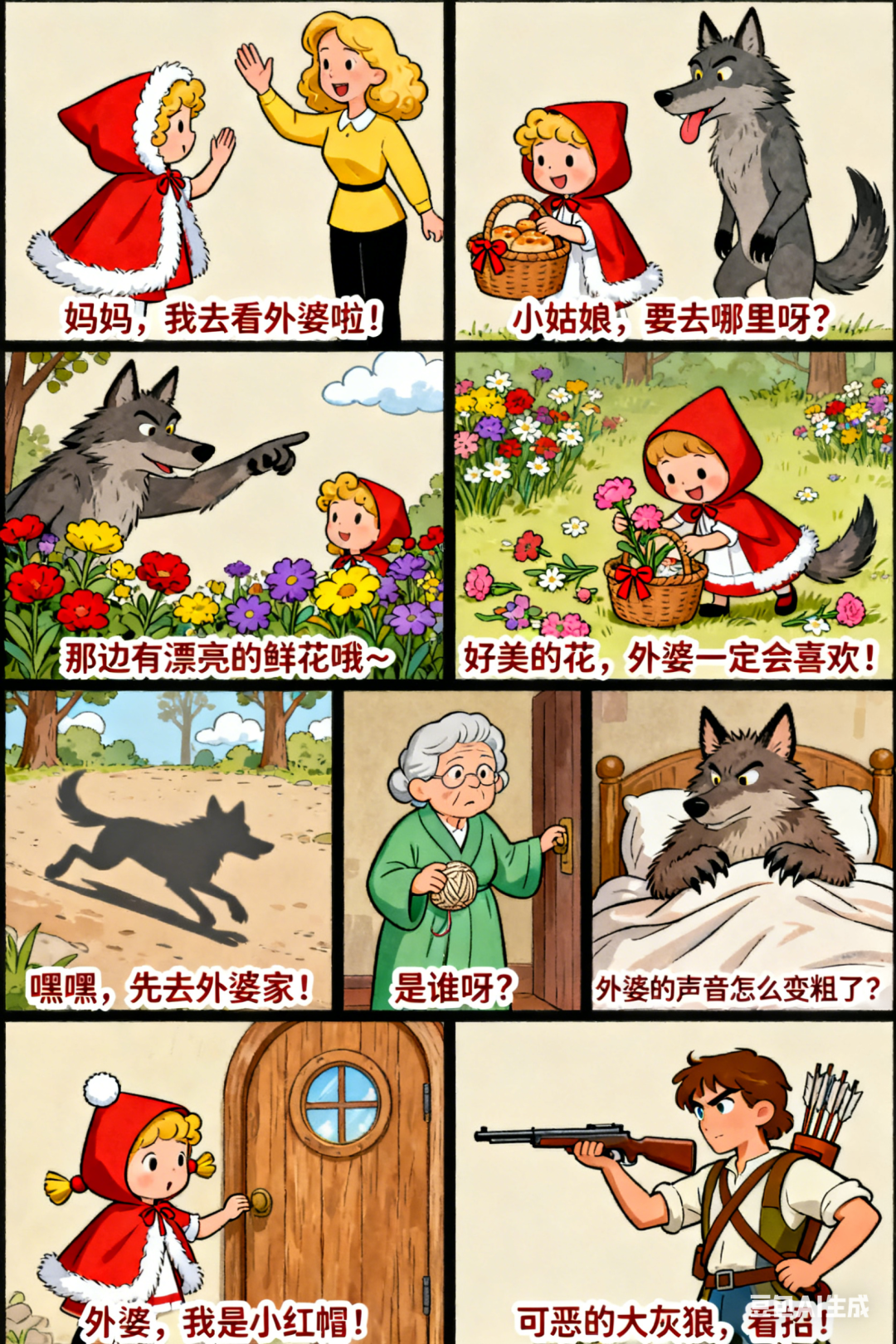 输出一份《小红帽》的9宫格漫画,漫画分镜合成到一张海报上,每张分镜上需要配文字
