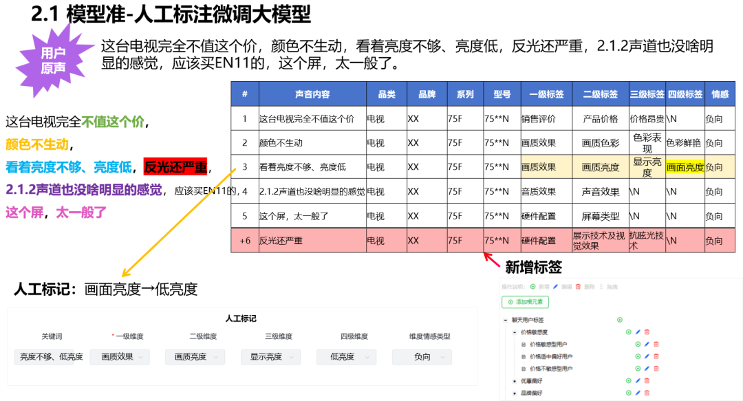 在这段话里用户提到了几个问题,大模型会识别出来进行打标,可以看到右侧的表格中,针对每一点都打好了标签,这时候我可能发现“看着亮度不够,亮度低”这一点,我可以有一个更准确的标签,这时候可以通过我们的平台进行标签的修改,保存后即可更新;然后我又发现,有一点,反光严重并没有打上标签,原因是我并没有梳理关于反光的标签分类,那这时候也可以在平台内把标签维护进去,维护好后再去选择就可以选到对应的标签,这样就补充上了缺失的标签。