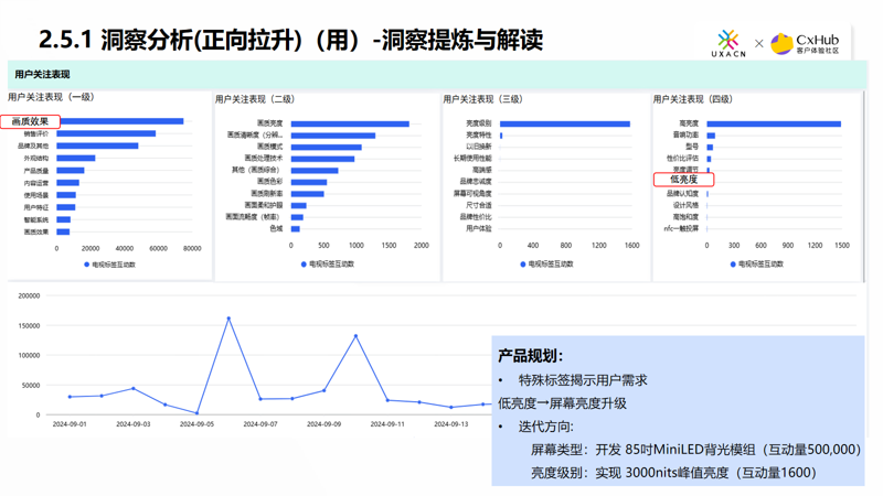 比如我们先看一级话题中用户对画质效果讨论最多,那我们可以再去看画质效果下的,二级、三级、一直到四级的关注点是什么,最终我们发现在四级的关注中,在低亮度这个话题下,大家有共同负向的声音,说的都是同一件事,就是我这个品的屏幕亮度不够,那针对用户的这个槽点,我们就可以去验证一下,进而明确我产品迭代的方向。