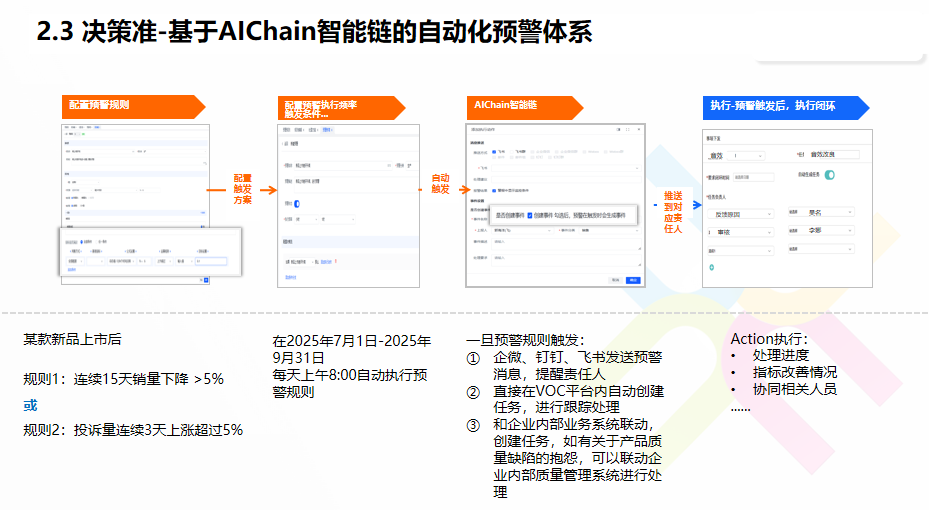 并且我们也有这种数据可视化、问题归因分析或者自助探索的能力,辅助业务人员找到问题,便于采取行动。针对不同的问题,我们可以预置好是发送通知、创建voc平台内的任务,还是和企业业务系统进行交互,比如告诉质量系统,需要处理某类质量问题,都是可以的。
