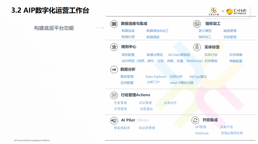 我们看下平台的具体功能,或者说我们企业需要具备底层哪些能力才能保障从声音的感知,分析洞察到闭环的过程,这个能力我们还是从刚刚说的三方面进行介绍数据、逻辑、行动。
