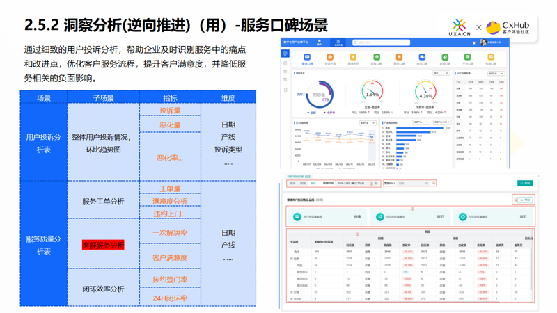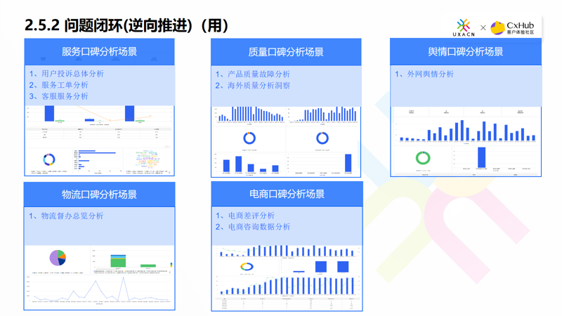 - 服务体验改善:投诉管理、体验优化、接待分析、风险监控、用户原声回溯、质检分析。