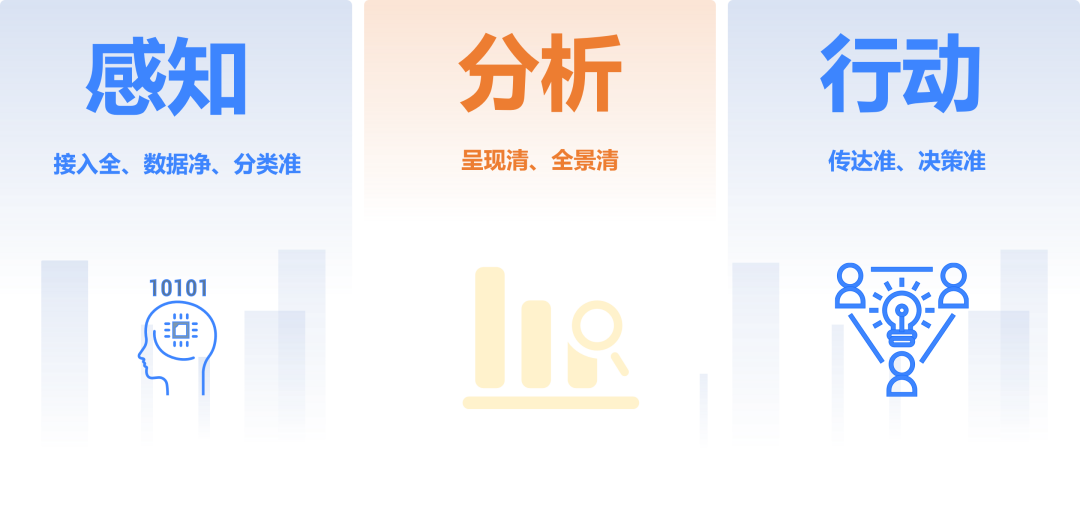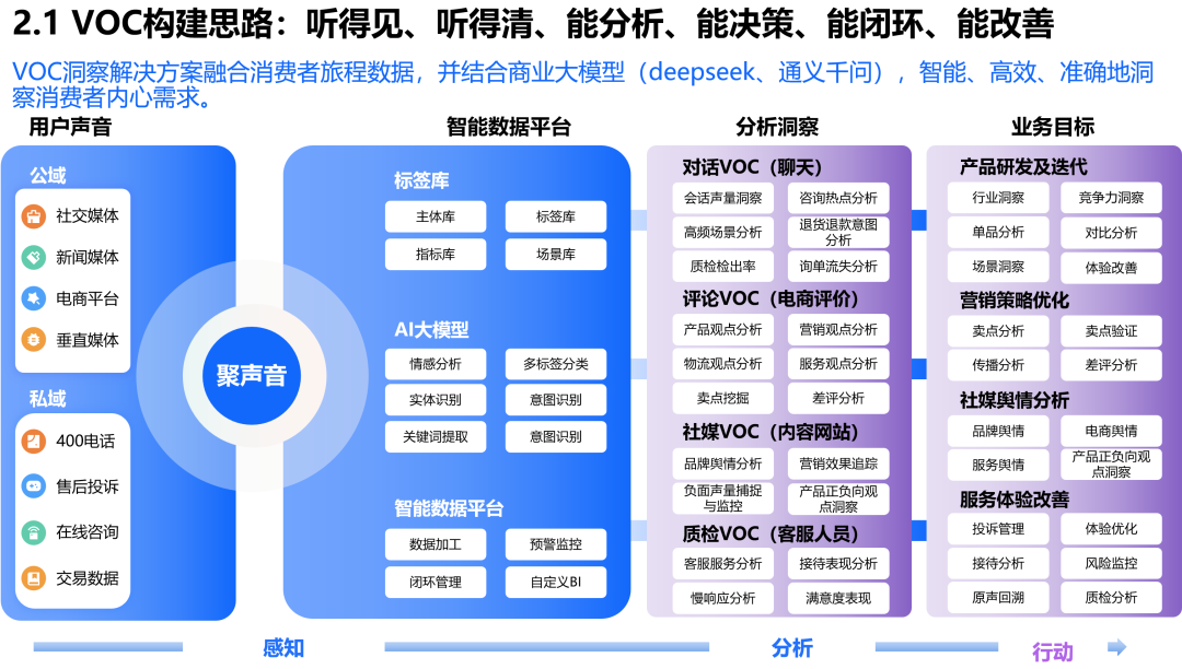1. 感知:在感知用户声音这部分,我们具备三个能力,数据接入全、保障数据干净、分类准、模型准,这才能更好保障我们后续的分析。