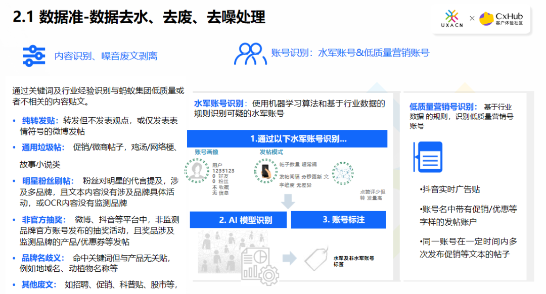 那VOC更是要从数据的源头开始清洗,因为如果我们接入了一些没用的用户声音对我们的分析反而是一种干扰,所以我们需要对数据进行去水去废,像有一些水军账号、纯是转发的帖子、促销、广告垃圾帖、明星粉丝刷帖、低质量的营销号等,这些其实我们是不需要进行采集的,这些我们就通过一些特定的规则、结合AI模型,把这些账号的数据过滤掉,保障我们接入的数据的干净可用。