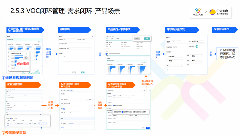 首先我们看在产品研发场景,大致是一个什么样的流程,比如我们通过VOC洞察发现用户对亮度的需求,他觉得亮度有些低,那负责用户声音洞察的运营人员,认为这个是需要改善的,那么他可以直接创建一个这样的需求,给到具体这个品的产研负责人。产研负责人需要和相关人员去讨论验证后,如果是真的应该去升级亮度,那么就去下发一个任务,去闭环。当然产品的需求洞察,也是有一定规律的,我们也可以去通过预警规则的设置,比如,某一个词语在某个时间段内提及量达到多少,给我推送一个消息,或创建一个需求给到对应人员去评审也是可以的。